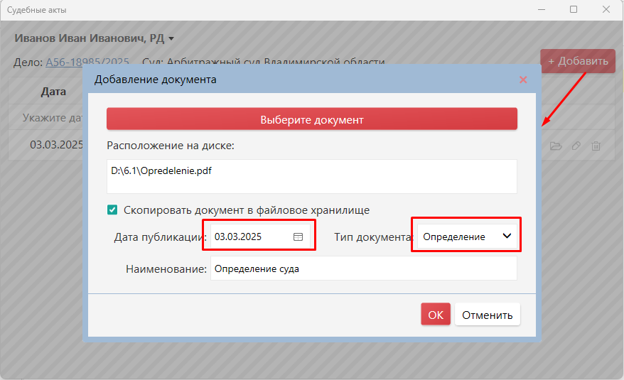 Для того чтобы объединить судебный акт с запросом нажмите на кнопку «Арбитр» в выпадающем списке выберите пункт «Открыть судебные акты на диске». Добавьте документ определения суда через кнопку «Добавить»