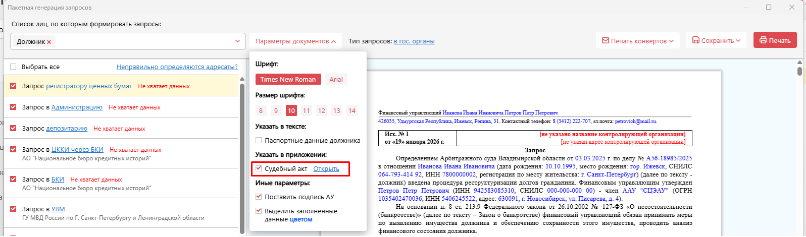 Для того чтобы в пакетной генерации запросов при сохранении в zip архиве был добавлен судебный акт установите галочку в «Параметры генерации» - «Судебный акт»