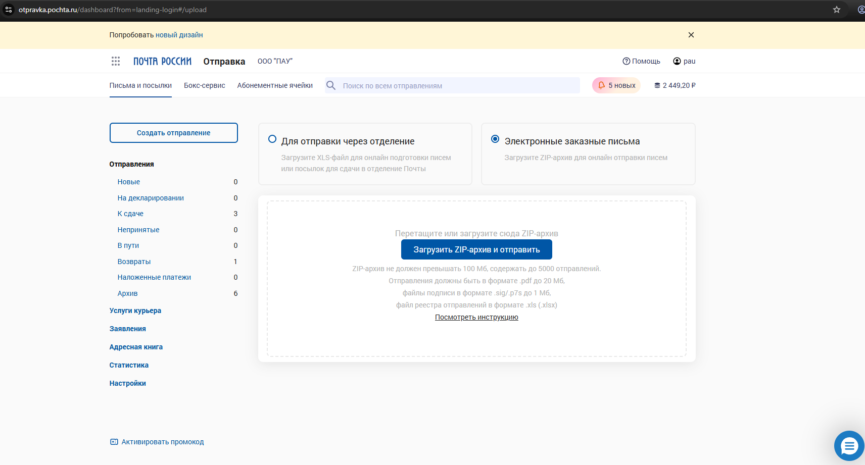 Инструкция по интеграции ПАУ с сервисом "Отправка" от "Почты России" (регистрация сервиса, создание партии отправлений на сайте Почты России, печать отправлений для передачи в ОПС)