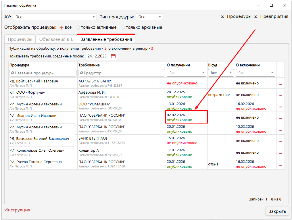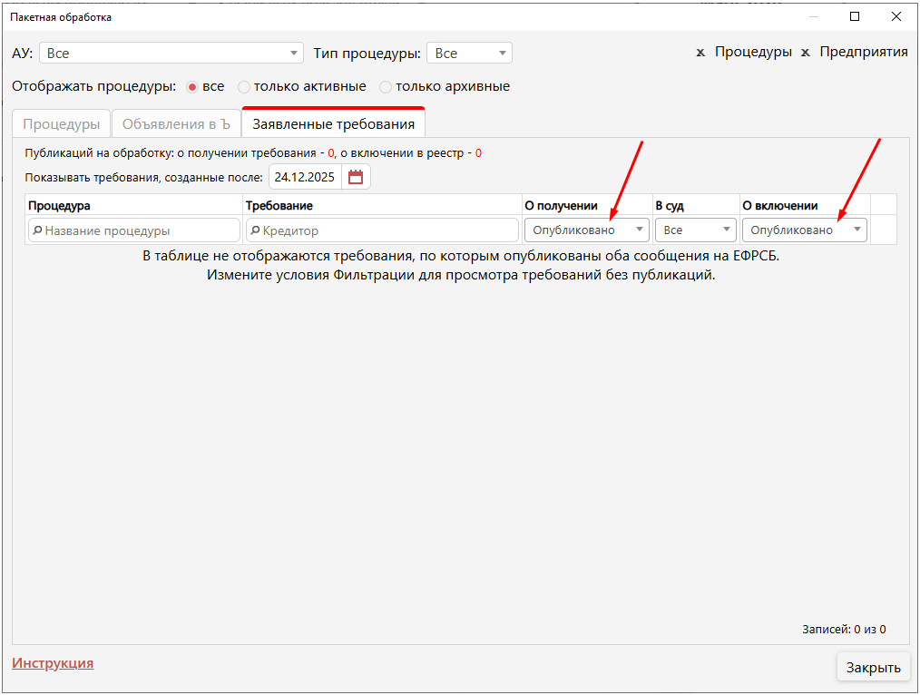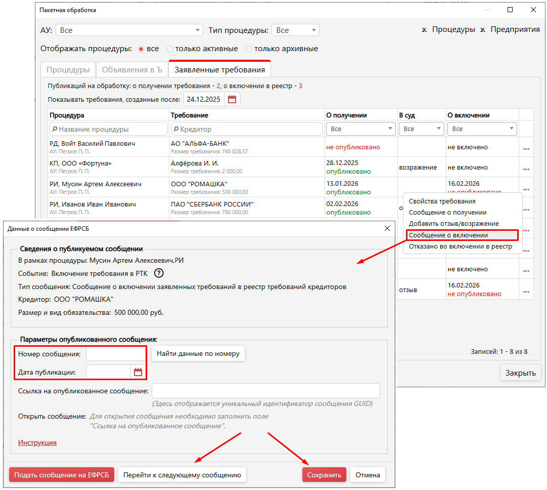 После того, как в требовании будут указаны сведения о публикации на ЕФРСБ (как о получении, так и о включении), требование исчезает из списка.