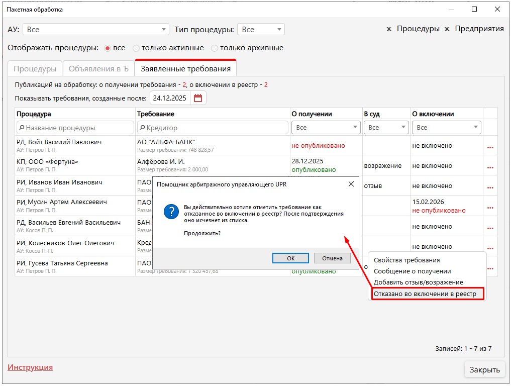 При выборе пункта «Отказано во включении в реестр» откроется окно подтверждения. Нажмите «ОК», чтобы отметить требование как отказанное. После нажатия «ОК» в свойствах требования отобразится галочка «отказано во включении в реестр», а само требование удалится из таблицы.