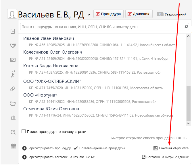 Для работы с заявленными требованиями откройте список процедур и нажмите кнопку «Пакетная обработка».