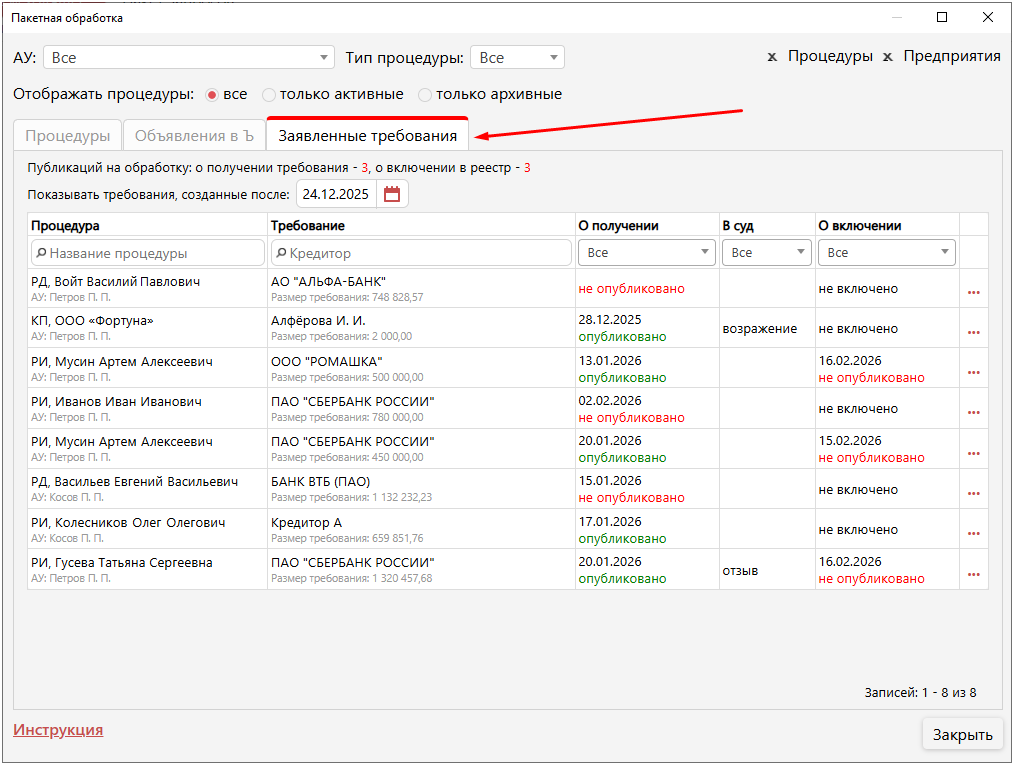 В окне «Пакетная обработка» перейдите на вкладку «Заявленные требования». Здесь представлена таблица с требованиями кредиторов по разным процедурам, по которым отсутствуют сведения о публикации сообщений на ЕФРСБ (о получении требования и о включении в реестр).
