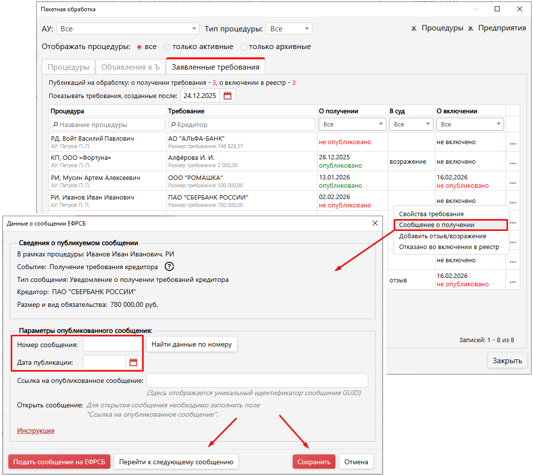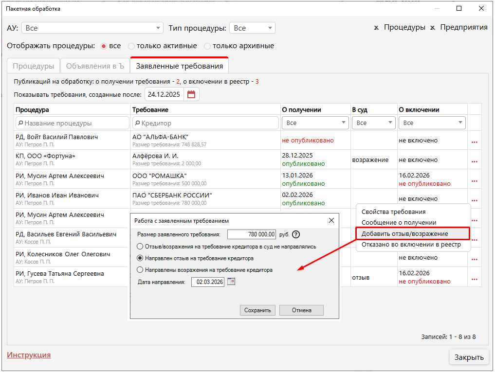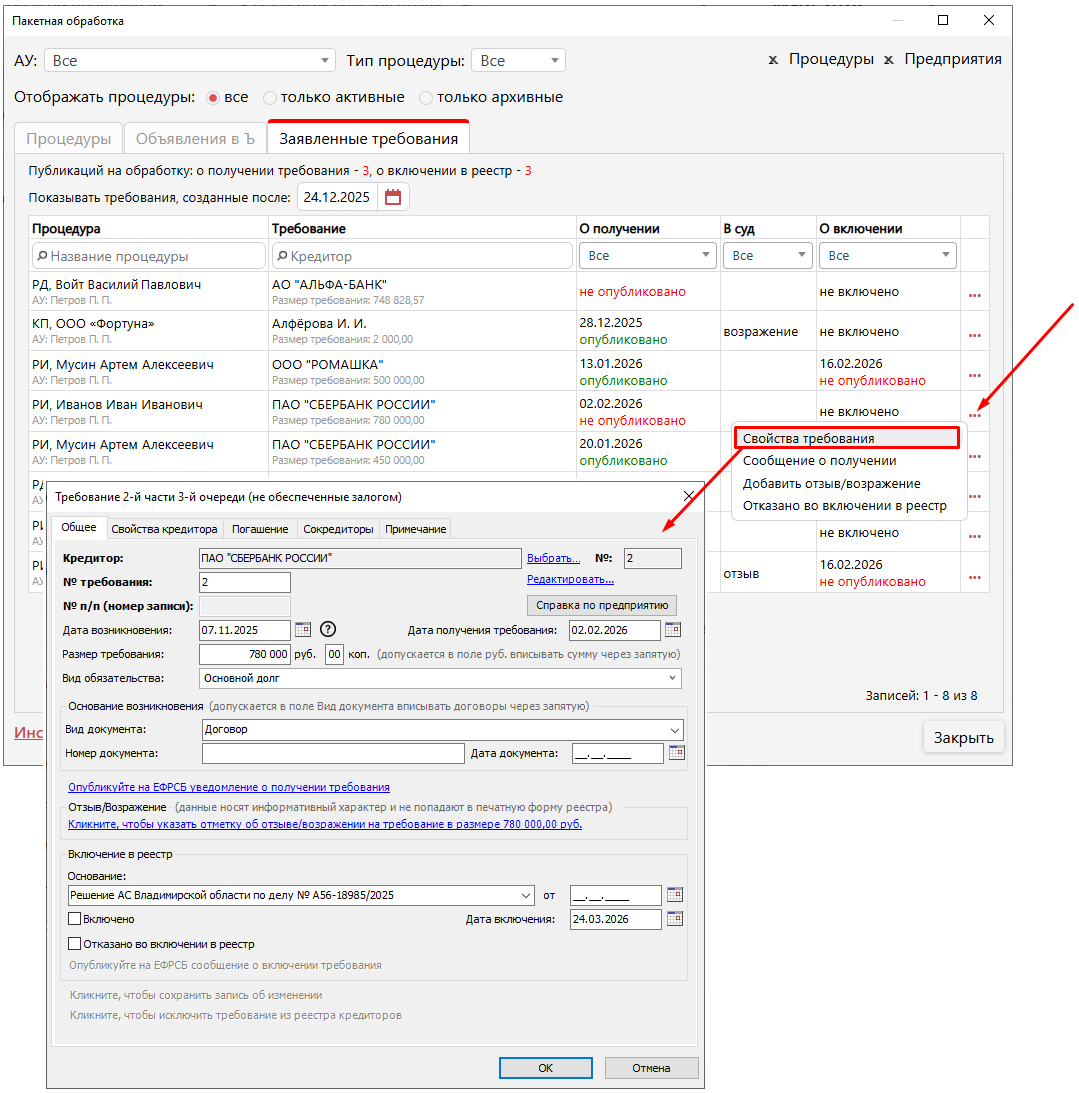 Начиная с версии 6.2 работа с заявленными требованиями кредиторов стала удобнее — сейчас все действия объединены в едином интерфейсе. Здесь доступно отслеживание публикаций на ЕФРСБ (о получении и о включении в реестр), просмотр требований, а также внесение отзывов, возражений и отметок об отказе во включении требования в реестр.