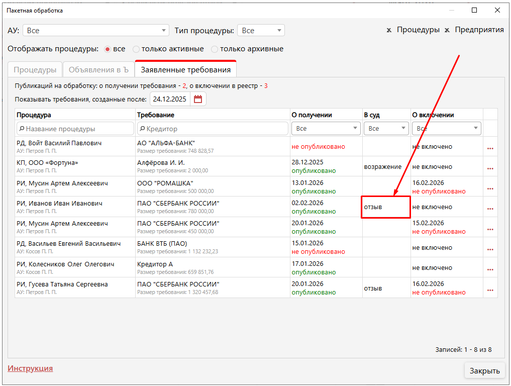 После выбора одного из пунктов (отзыв/возражение на требование кредитора) и сохранении изменений, в колонке «В суд» отобразится соответствующий вариант «отзыв» или «возражение».