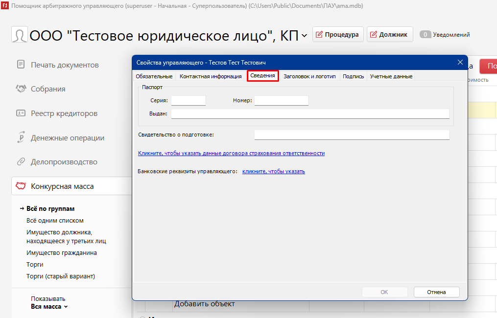 Во время работы и формировании различных правовых документов, «Помощник» использует готовые шаблоны и подставляет в них имеющиеся данные о процедуре, должнике и арбитражном управляющем. Заполняйте эти сведения в первую очередь, чтобы программа могла корректно генерировать документы.